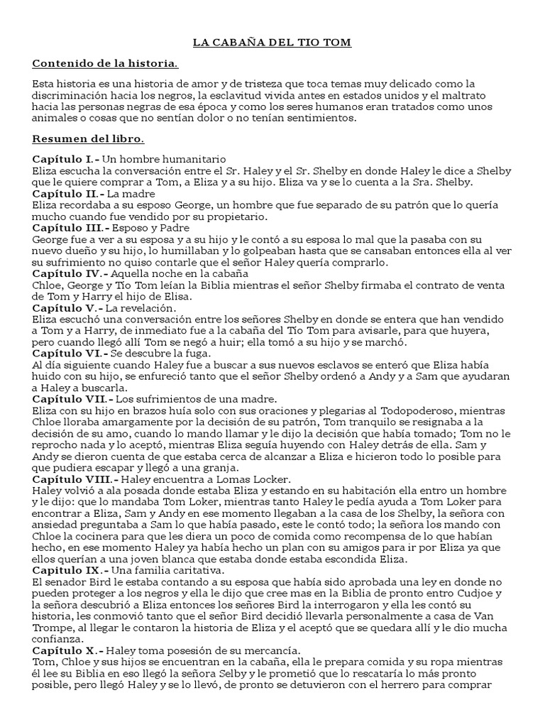 De que trato el texto la historia comienza cuando en una casa que se encontraba en el distrito kentucky se podían ver unos hombres negociando, acerca de los esclavos, uno de ellos era el señor selby, quien gracias a problemas que tenia con sus negocios, tenía que. Resumen de la cabaña del tío tom. La huida de eliza capítulo ix. Una historia en donde la crueldad y la compasion se mezclan. La historia transcurre en kentucky, antes de la abolición de la esclavitud y se centra en el relato del tío tom, un esclavo afroamericano en torno al cual se.